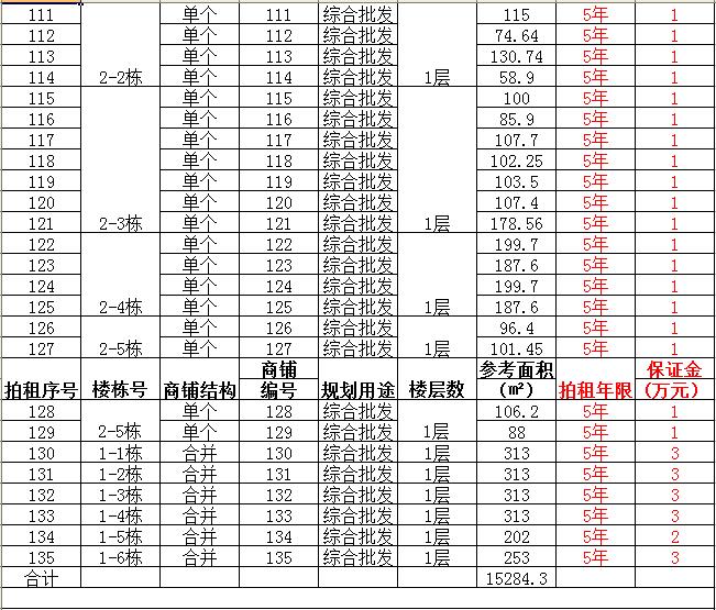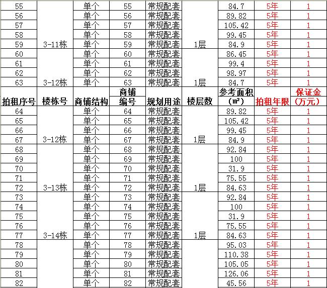 (一)拍租單個(gè)商鋪129間,使用期5年,每間商鋪預(yù)交競(jìng)租保證金1萬(wàn)元, 詳見商鋪簡(jiǎn)介(欲競(jìng)租多間商鋪,保證金類推);