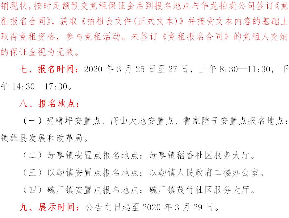 經(jīng)鎮(zhèn)雄縣人民政府批準(zhǔn),受相關(guān)部門(政府)委托,公開拍租位于鎮(zhèn)雄縣易地扶貧搬遷工程呢嚕坪安置點7棟獨立商鋪使用權(quán)、高山大地安置點27間(棟)商鋪使用權(quán)、魯家院子安置點24間(棟)商鋪使用權(quán)、母享安置點146間商鋪使用權(quán)、以勒物流城安置點67間(棟)商鋪使用權(quán)、碗廠安置點114間商鋪使用權(quán)。相關(guān)事項如下: