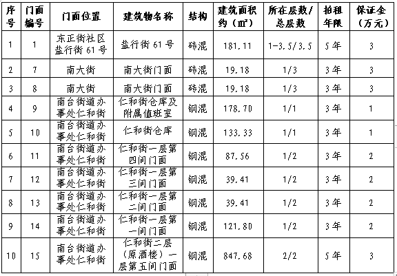 拍租10個國有門面使用權,詳見下表: