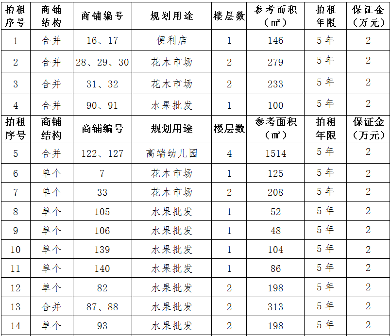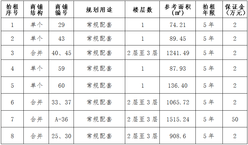 四、預交競租保證金:按商鋪簡介標準預交競租保證金。競租人交納的保證金以銀行到賬時間為準(保證金交納人名稱與競租報名人名稱必須一致),截止時間2021年12月10日16時30分。成交的競租保證金轉為第一年租金的一部份,未成交的競租保證金全額退還,不計利息。