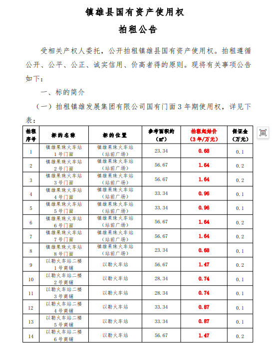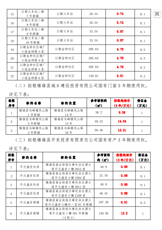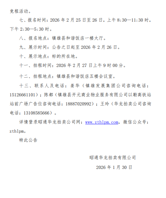 鎮(zhèn)雄縣國有資產(chǎn)使用權(quán)拍租公告